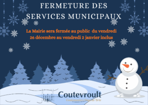 En raison des congés de fin d’année la mairie sera exceptionnellement fermée au public du vendredi 26 décembre au vendredi 2 janvier inclus.